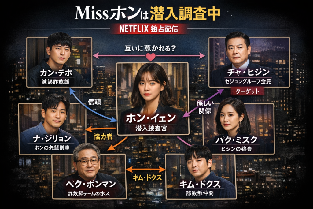 この記事では、『Missホンは潜入調査中』の配役相関図をもとに登場人物の関係性を整理しながら、物語の見どころや注目ポイントを詳しく解説します。